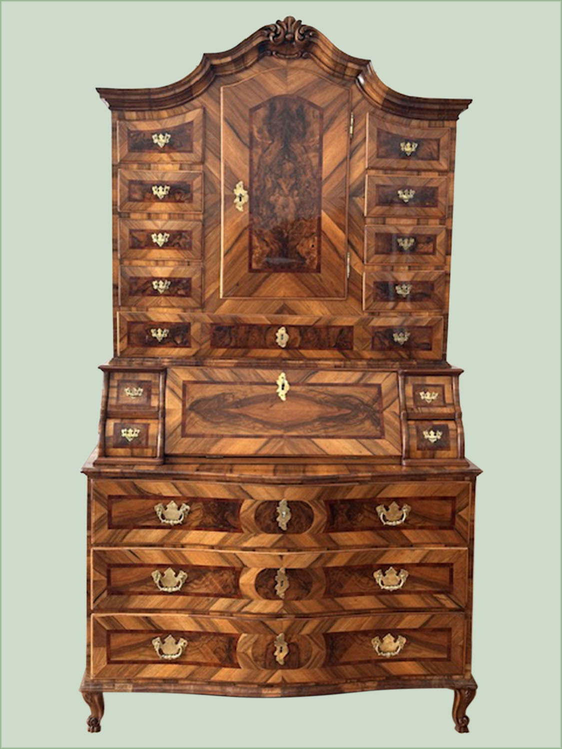 Schreibfach mit aufklappbarer Schrägklappe, flankiert von je zwei Schüben, drei Schubladen im Innenleben. Geschweifter Aufsatz mit zentraler Tür, gerahmt von 8 Schubladen, eine durchgehende Schublade unterhalb der Tür. Original Beschläge Schlösser und Schlüssel