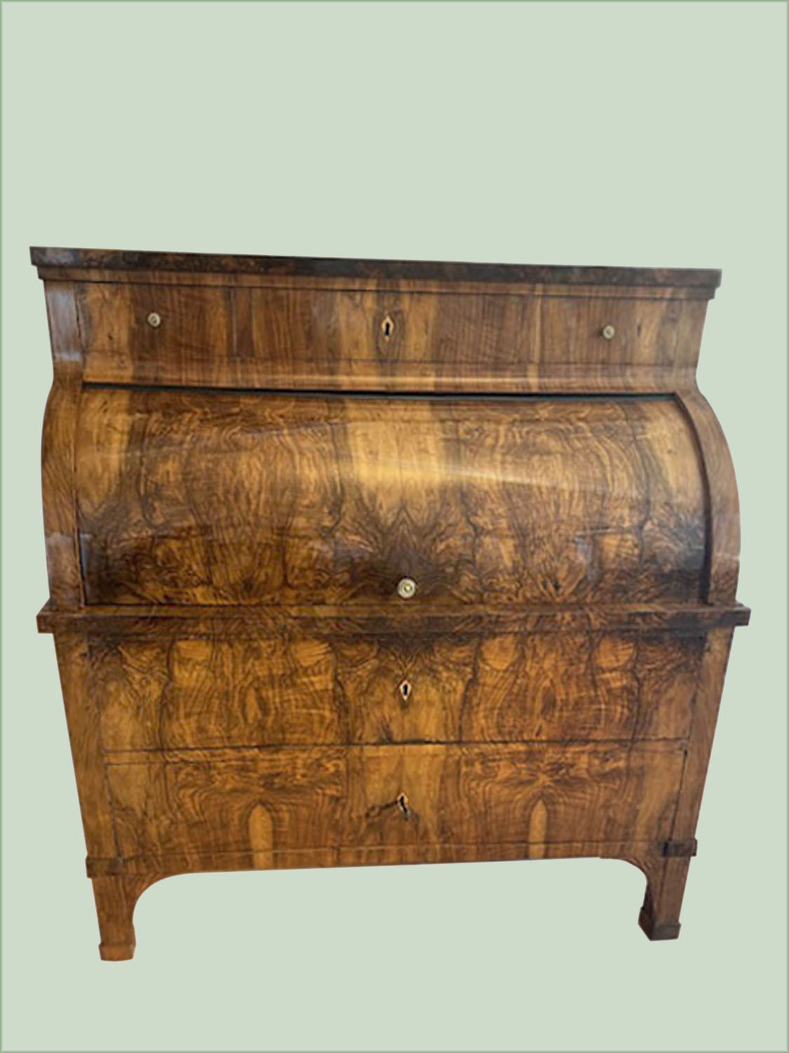 Sehr schönes Zylinderbureau, mit sehr schönem Nussbaumwurzelholz ,spiegelbildlich furniert , zwei schübiger  Unterbau auf Stollenfüssen, ausziehbare Schreibplatte mit Zylinderverschluss, dahinter ein schönes Innenleben mit mehreren Schubladen und einer Mitteltür,