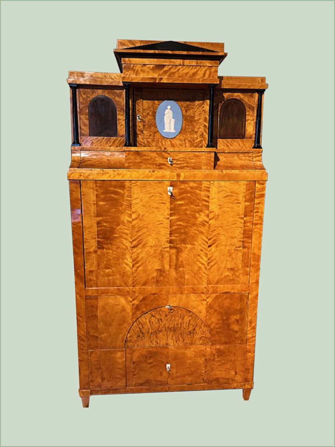 Sekretär mit monumentalem, giebelförmigem Aufsatz, mit über Eck sowie mittig gestellten ebonisierten Säulen und einem Medaillon in Wedgwood-Art.