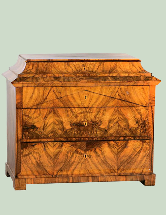Nussbaum furniert, 4 Schubladen, in der zweiten Schublade Spitzgiebel eingearbeitet, Plattenkante abgesetzt , sehr schönes Furnierbild und Ausstrahlung.