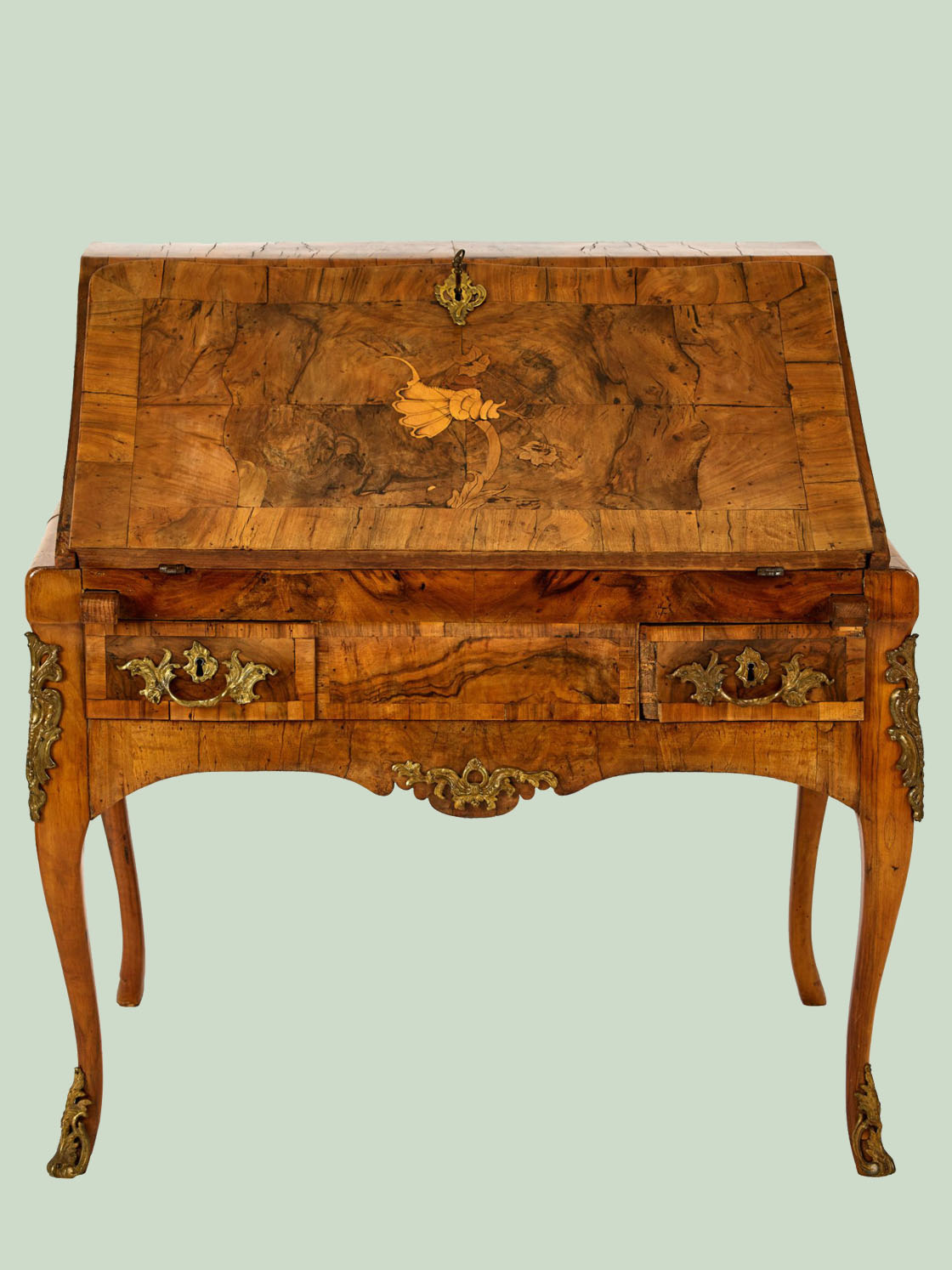 Sehr schöne zierliche Ausführung, Nussbaum furniert, mit verschiedenen Edelhölzer eingelegt, Süddeutschland um 1730-40, Original feuervergoldete Beschläge, typisch für diese Zeit mit Rocaillien.