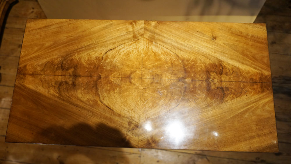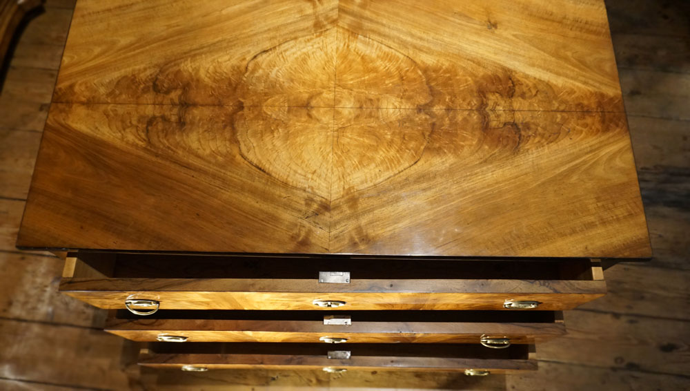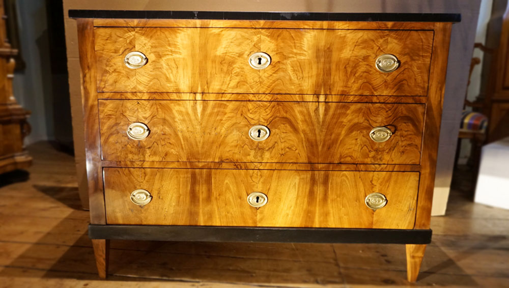 Nussbaum furniert, Süddeutschland, 3-schübig, Originalbeschläge und -Schlösser, sehr schönes gespiegeltes Furnierbild und strenge Form, charakteristisch für die frühe Entstehung der Biedermeier Epoche.